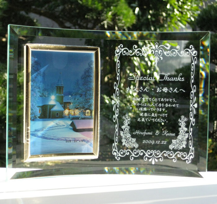 記念日のギフトにどうぞ【送料無料】オリジナルデザインもできるフォトフレーム(フラット)【10P17may10】【送料無料0517_kaimawari】【ポイント0517_kaimawari】 価格: 4,200円 レビュー評価:0.0 レビュー数:0 ステップ1 模様デザインを選んでください。ステップ2 文字フォントを選んでください。 ステップ3 ショッピングカートにすすんで「※備考」で彫刻する文字を記入してください。オーダーメイドのフォトフレームであなただけのオンリーワンのフォトフレームを!!ガラスの透明感がインテリアをお洒落に演出します。デザインやメッセージなどは自由にご注文いただけます。カートに進んで備考欄にご希望をご記入ください。**************************************************************************************************■フレーム Supported by 楽天ウェブサービス |
